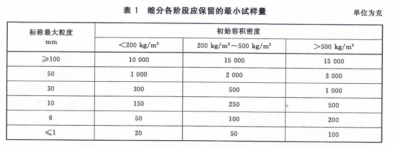 4.1樣品縮分后的最小試樣量:表1給出了每一縮分階段應(yīng)保留的最小樣品質(zhì)量,它主要取決于物料的標(biāo)稱最大粒度和容積密度。標(biāo)稱最大粒度可通過篩分試驗(yàn)確定,容積密度的測(cè)定方法見附錄C,部分物料的初始容積密度參見附錄D。除了表1中說明的最小質(zhì)量之外,還應(yīng)保證縮分后的樣品量能滿足實(shí)際試驗(yàn)的需要。